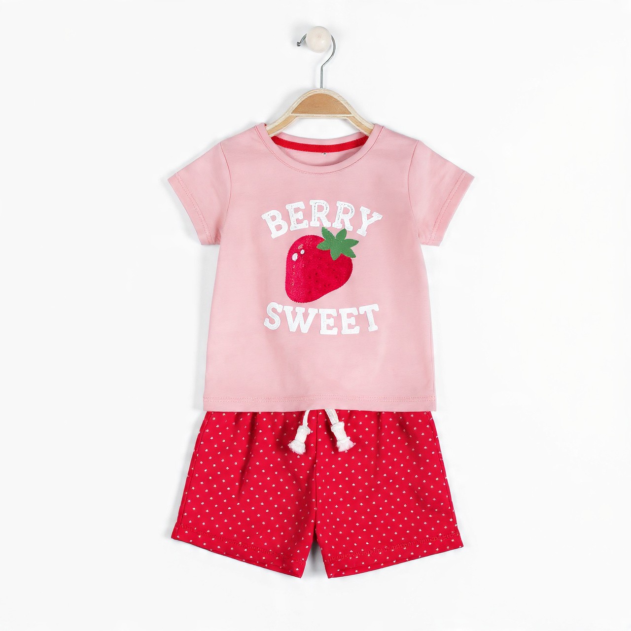 This cute 2-piece half-sleeve outfit is perfect for sunny days. Features a soft blush-pink cotton t-shirt with a sparkly strawberry and bold 'BERRY SWEET' print. Paired with vibrant red shorts with all-over tiny white polka dots, soft elastic waist and cute white drawstring tassels.
