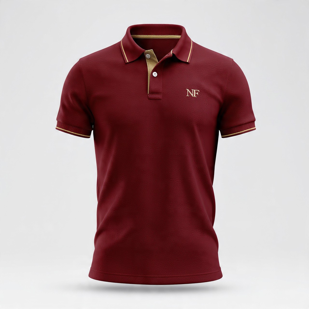 Deep maroon pique cotton body elevated by luxe gold tipping on the collar and sleeve cuffs, plus a contrasting sand-gold inner placket for a designer finish. Finished with a refined gold 'NF' embroidery on the chest and pearl-white buttons. Rich color, premium feel.
