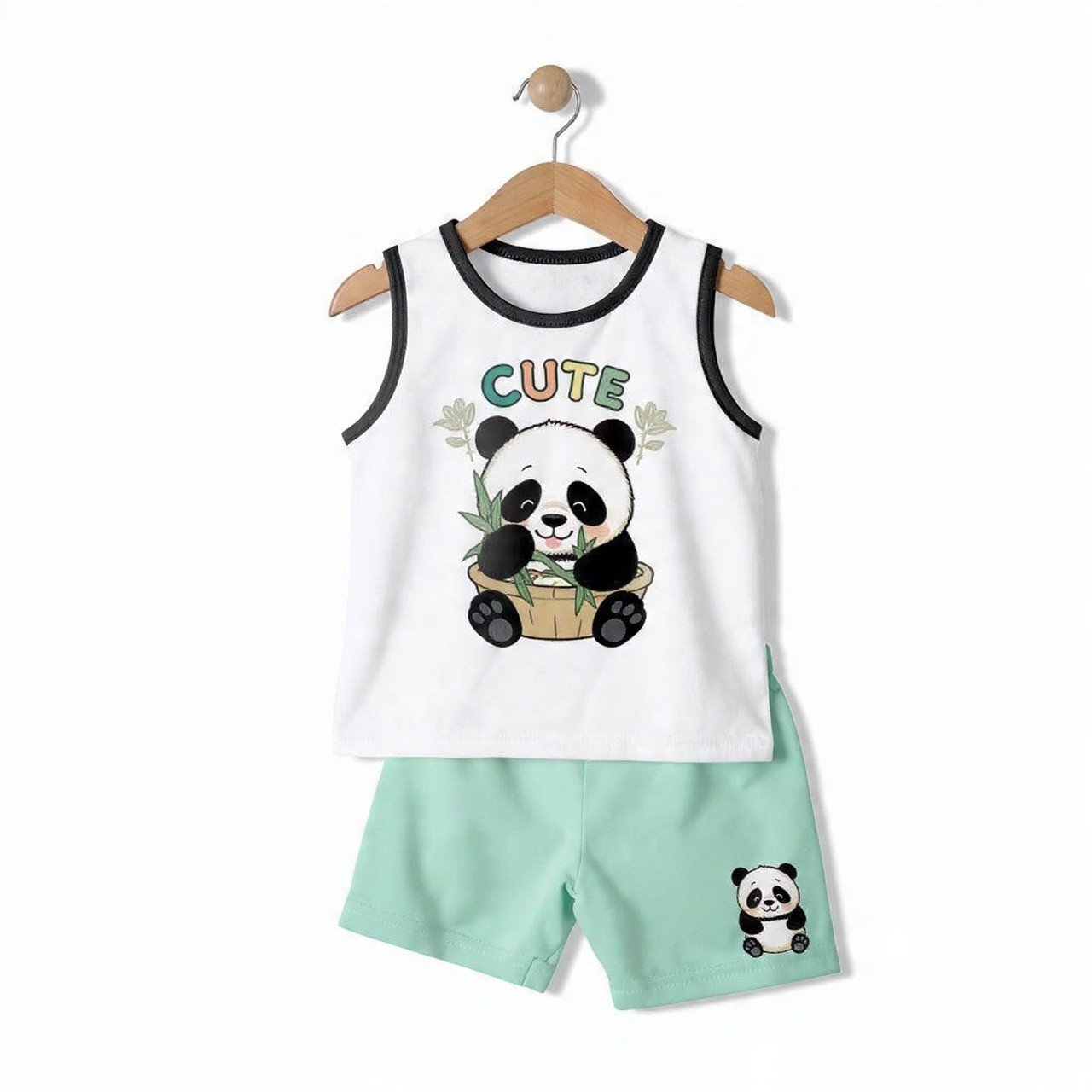 This adorable unisex 2-piece set features a soft white sleeveless cotton top with black contrast trim and a super cute panda munching bamboo graphic with colorful 'CUTE' text. Perfectly paired with comfy mint green shorts featuring a tiny panda embroidery on the leg.