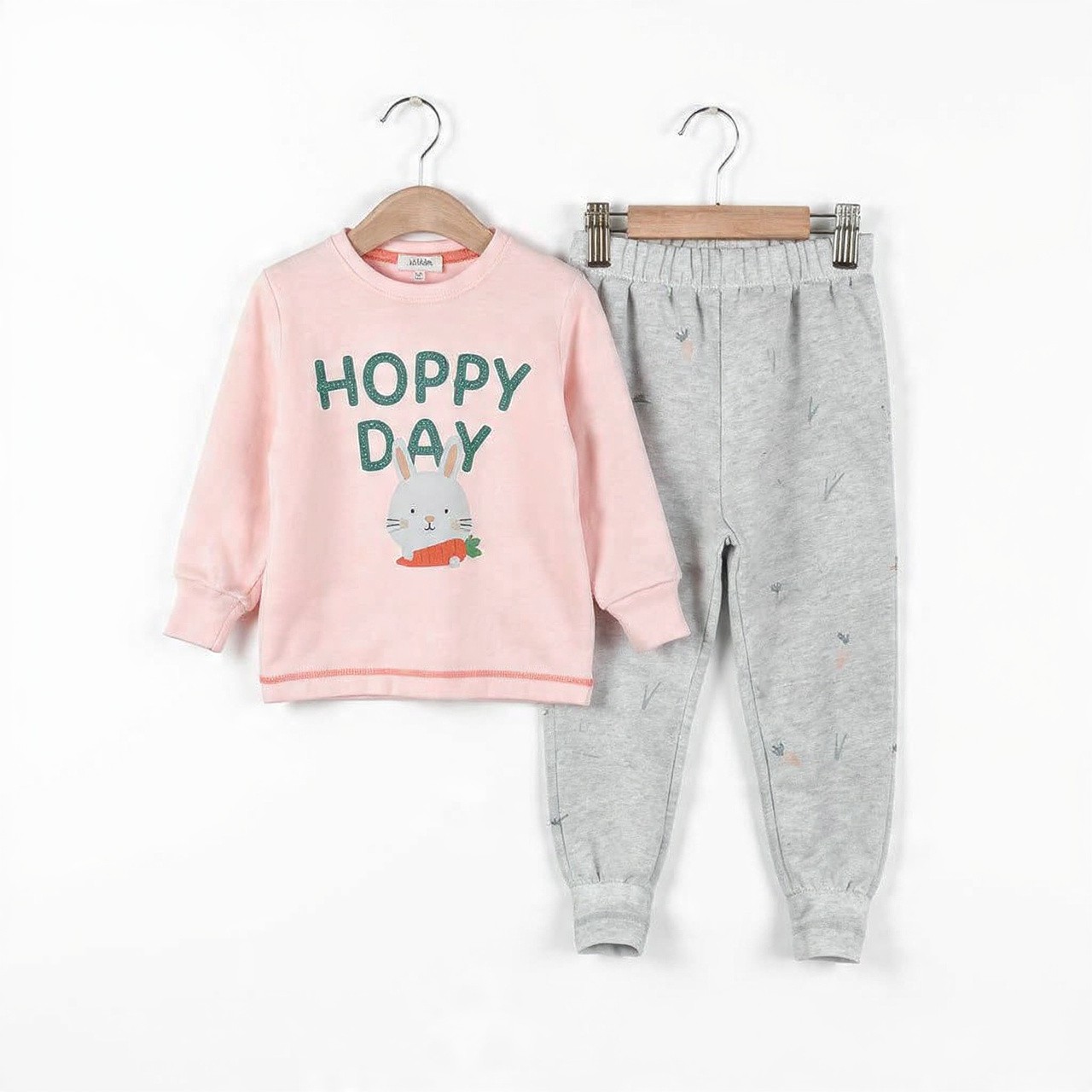This adorable 2-piece full-sleeve outfit is made for cozy play and sweet dreams. Features a soft peach-pink cotton long-sleeve t-shirt with a cute bunny holding a carrot and bold 'HOPPY DAY' print. Paired with light grey pajama pants with all-over tiny carrot prints and snug cuffed ankles.
