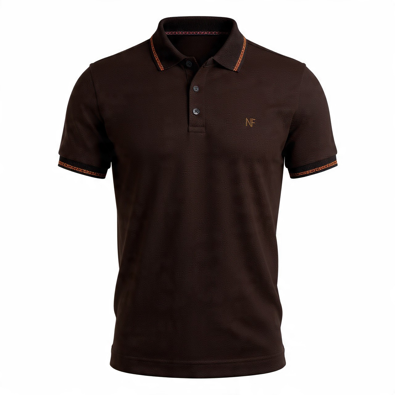Rich chocolate-brown pique cotton with fine jacquard tipping in burnt orange and black along the collar edge and sleeve cuffs. Minimal design, maximum detail – finished with a tonal brown 'NF' embroidery and matching dark buttons for a clean, mature look.