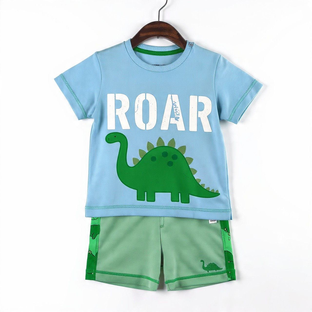 This dino-mite 2-piece half-sleeve outfit is built for little explorers. Features a soft sky-blue cotton t-shirt with a big bold 'ROAR' text and a friendly green dinosaur appliqué. Paired with comfy mint-green shorts with dino side panels and a mini dino print.