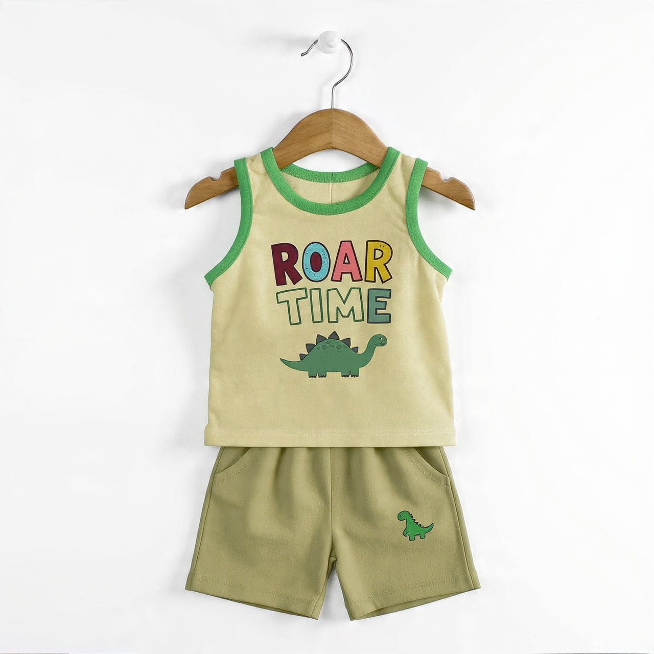 This dino-mite 2-piece outfit is perfect for little explorers. Features a soft beige sleeveless cotton top with green contrast binding and a fun 'ROAR TIME' graphic with a cute green stegosaurus. Paired with comfy olive green shorts featuring a tiny dino embroidery and side pockets.