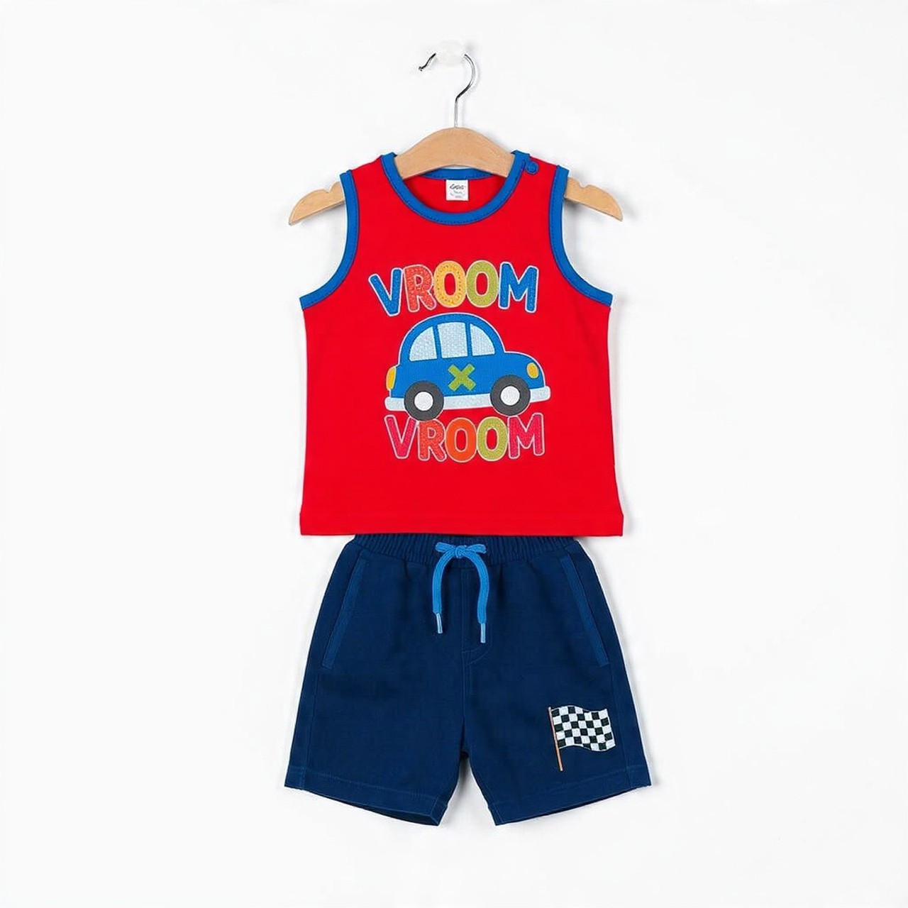 This speedy 2-piece summer outfit is built for little racers. Features a bright red sleeveless cotton top with blue contrast binding and a fun 'VROOM VROOM' graphic with a cute blue race car. Paired with comfy navy shorts featuring a checkered racing flag embroidery and side pockets with drawstring waist.