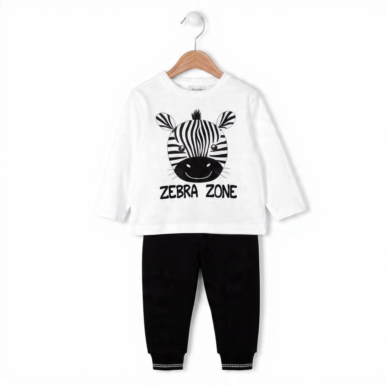 This stylish 2-piece full-sleeve outfit is perfect for cool little trendsetters. Features a soft white cotton long-sleeve t-shirt with a cute zebra face and bold 'ZEBRA ZONE' print. Paired with solid black pajama pants with elastic waist, snug cuffed ankles with contrast stitch detail.